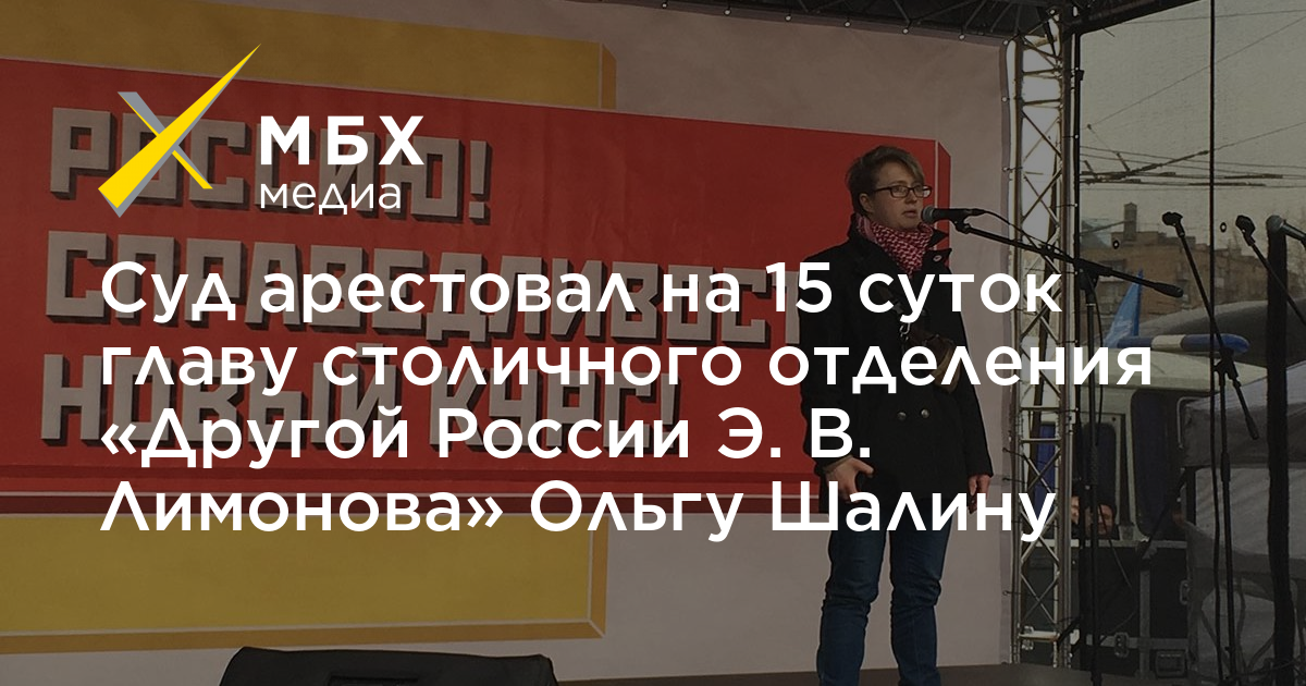 Кунцевский суд Москвы назначил 15 суток ареста главе столичного отделения «Другой России Э. В. Лимонова» Ольге Шалиной, задержанной накануне вместе с участницей Pussy Riot Марией Алехиной. Об этом «МБХ медиа» сообщили в пресс-службе партии.
