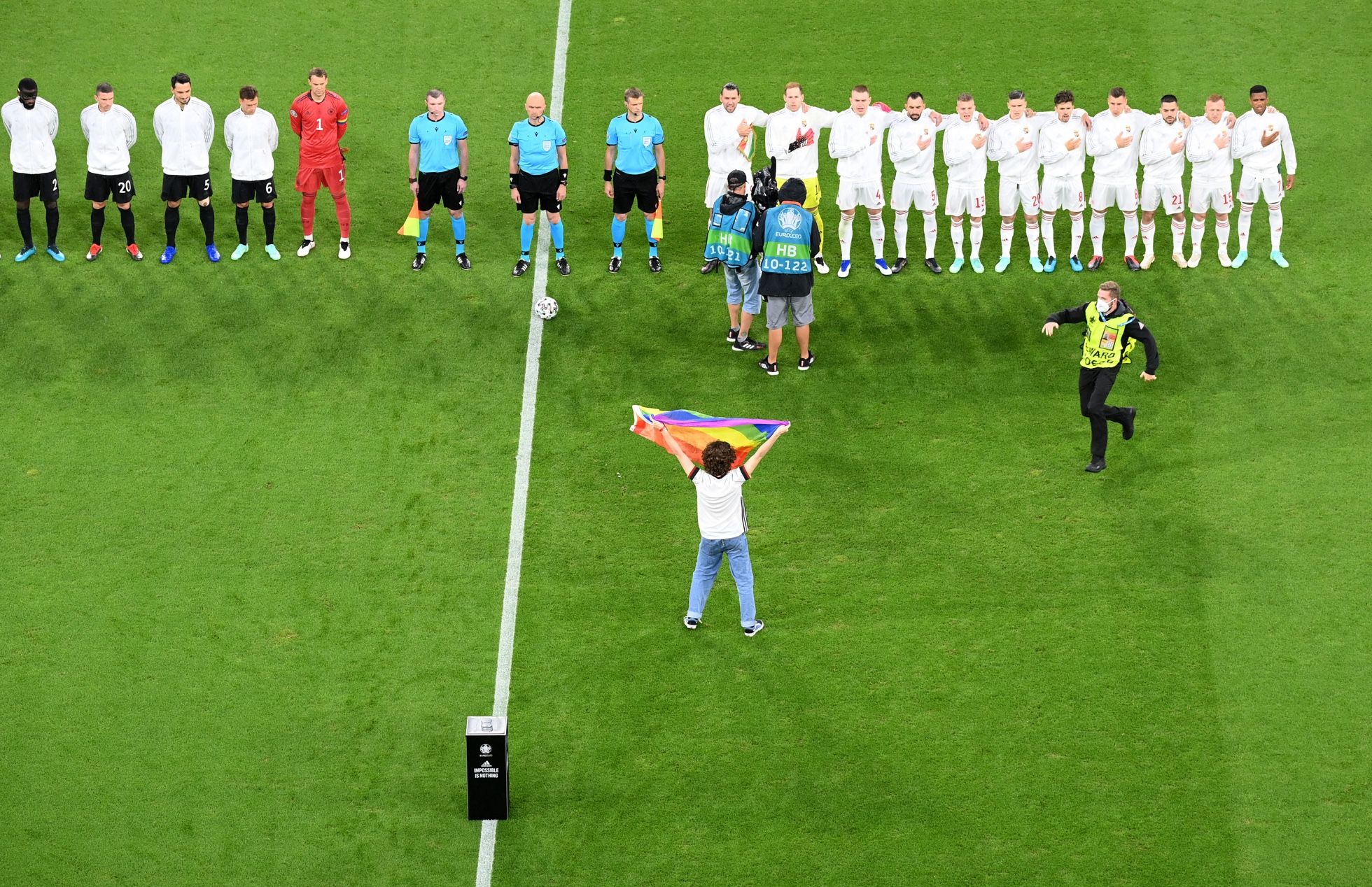 Matthias Hangst / Getty Images Перед началом матча Германия — Венгрия на Евро-2020 на поле стадиона в Мюнхене выбежал активист с радужным флагом. Он поднял его на глазах у футболистов во время исполнения гимна Венгрии. Неделю назад парламент Венгрии принял закон, который запрещает распространять в школах материалы о гомосексуальности и трансгендерности. Против этого закона выступили многие страны ЕС.