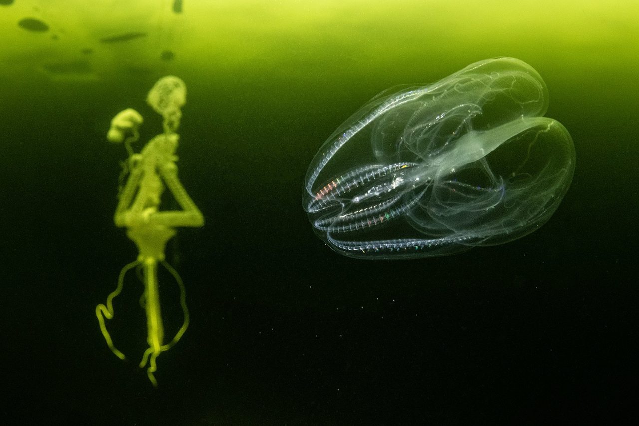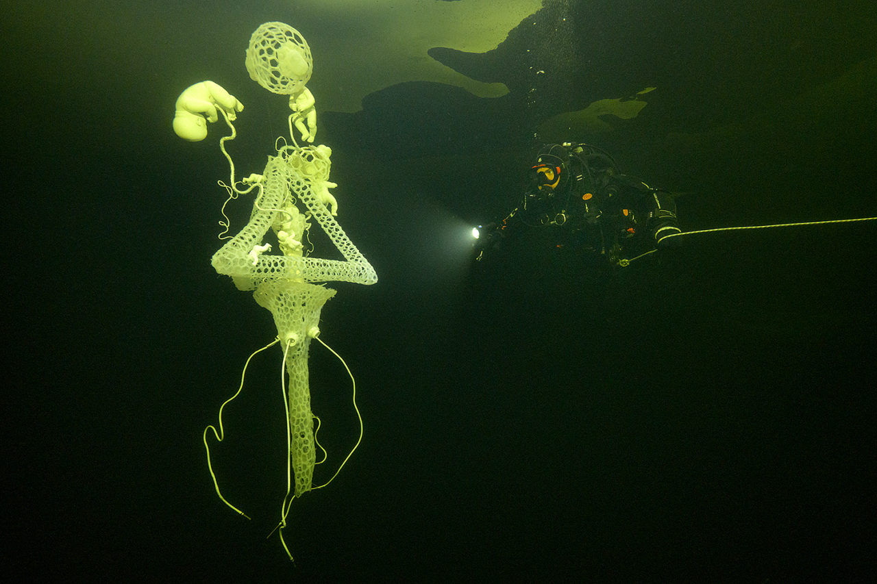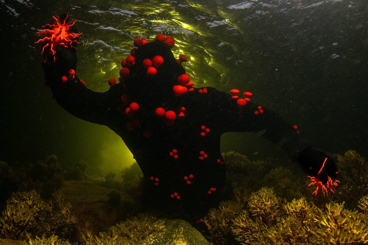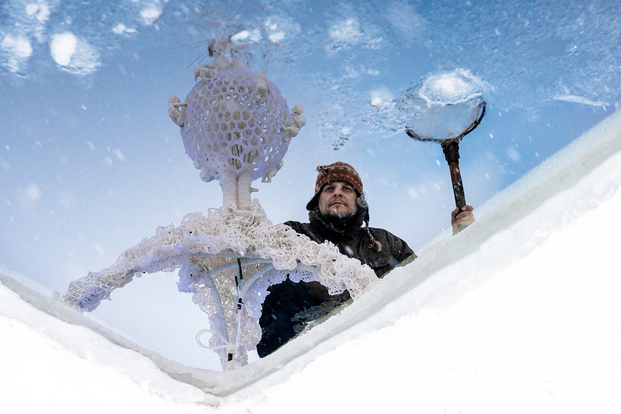 Гребневик болинопсис плывет мимо скульптуры «Вода — мать всего сущего» на выставке Лотарева «Глубокая заморозка» подо льдом Белого моря. Подледная выставка — редкий случай, когда среди посетителей не только и не столько люди, а все больше животныеФото: Виктор Лягушкин Внутри человека тоже много демонов. Они испокон веков олицетворяли очень разные вещи — от пороков до природных явлений. Если бы древнему человеку рассказали, как сейчас гибнут рыбы и животные из-за пластика или разлива нефти, он бы представил себе человекоподобного монстра. И я пытаюсь войти в такое шаманское состояние, делаю многочисленные эскизы и если чувствую, что мой демон передает проблему, то фиксирую пришедший образ.