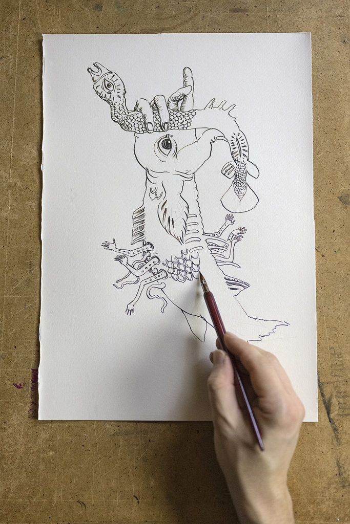 Лотарев переносит тушью на бумагу очередной придуманный образФото: Виктор Лягушкин «Меня привлекает время исследователей. Когда мир был настолько мало изучен и полон тайн, что художники не видели разницы, что рисовать, — вымышленное существо или реально существующее, слона или василиска. Оба были для них фантастичны. С тех пор мы многое узнали об устройстве мира, но и что-то потеряли. Например, детское восприятие мира. Детское не в смысле глупое, а наивное, настоящее, дикое.
