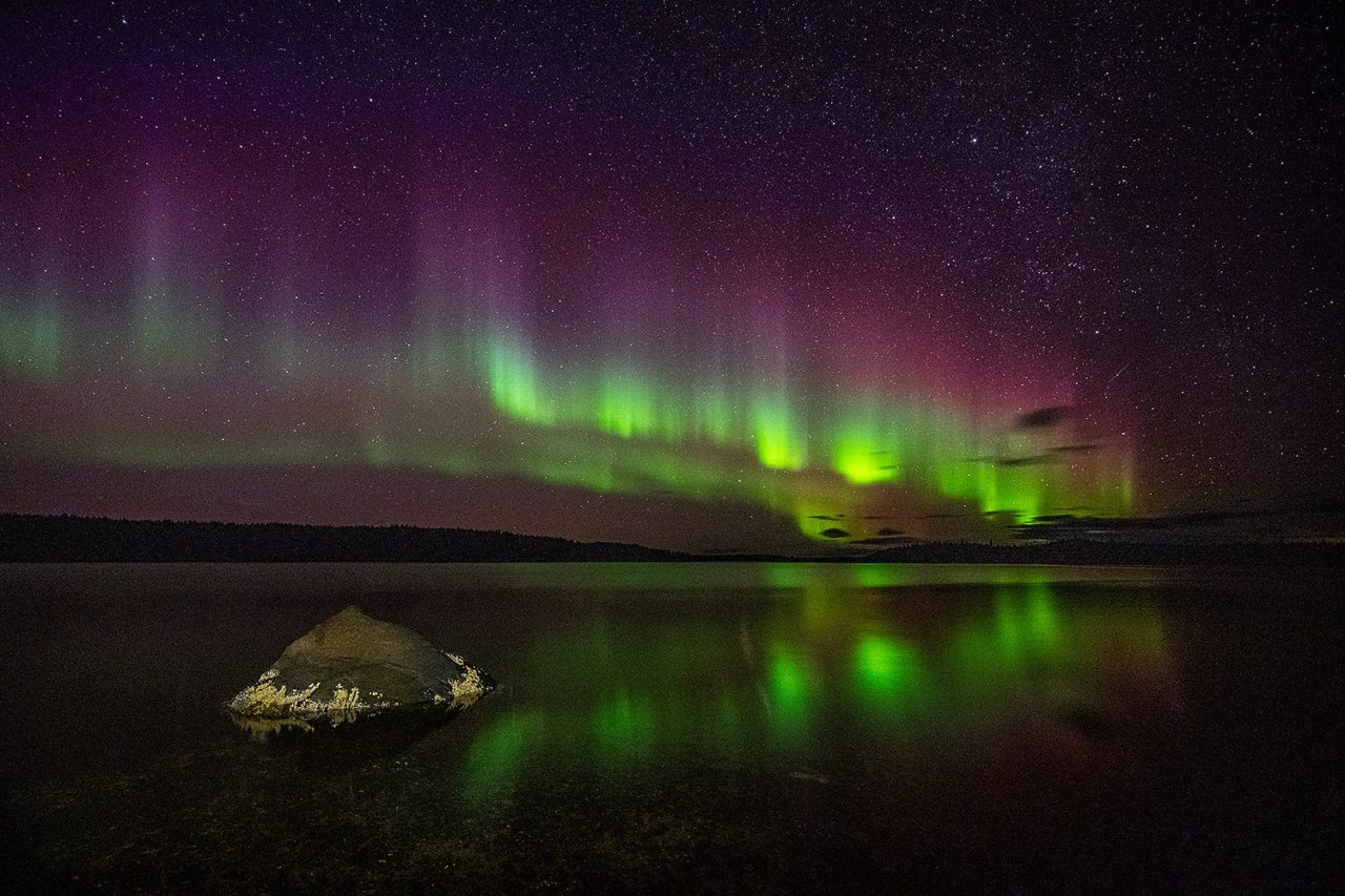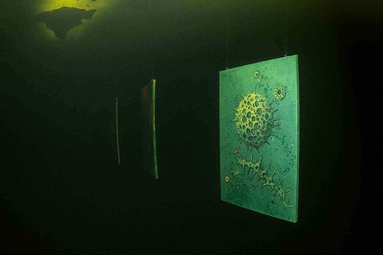 Северное сияние над заливом НильмогубаФото: Виктор Лягушкин В 2018-2019 годах на Белом море Денис Лотарев написал серию работ «Сфера», которая была навеяна игрой света на морском дне, формой арктических животных и мыслями об источнике жизни. И в 2021 году Денис наконец решился сделать выставку, но не где-нибудь в музее или галерее, как обычно, а под водой. Картины были подвешены ко льду около острова Большой Крестовый в заливе Нильмогуба, где предпочитал работать Лотарев. Посетителями стали дайверы и фридайверы, приезжающие нырять на Белое море.