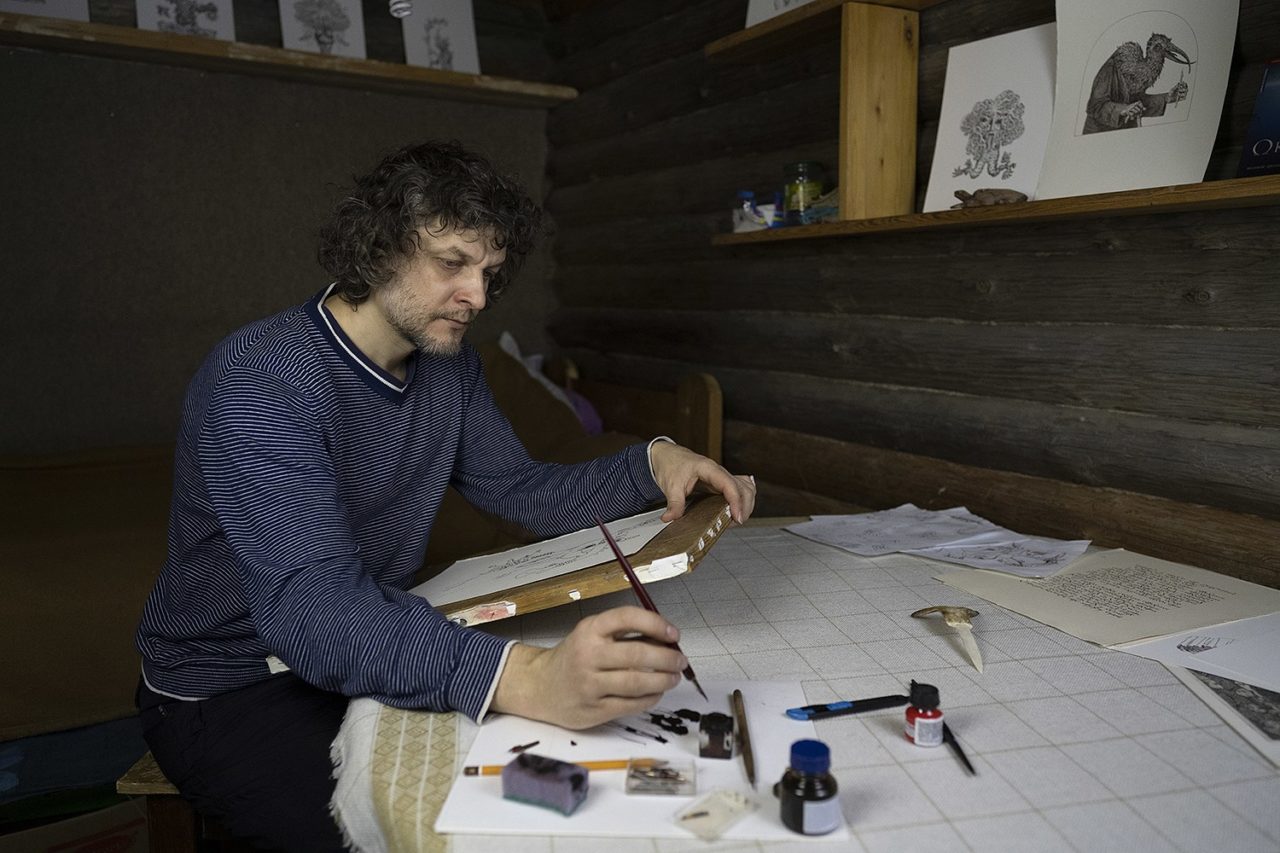 Денис Лотарев работает над иллюстрациями для книги «Беломорский бестиарий» в избушке в деревне НильмогубаФото: Виктор Лягушкин Всю прошлую зиму Денис, сидя у русской печи в избушке в деревне Нильмогуба, придумывал образы для книги «Беломорский бестиарий». Книга рассказывает о жизни Белого моря, причудливо сплетая наивный взгляд натуралиста XVII века с мировоззрением человека XXI века. Из-под пера Лотарева один за другим появлялись демоны и чудовища.