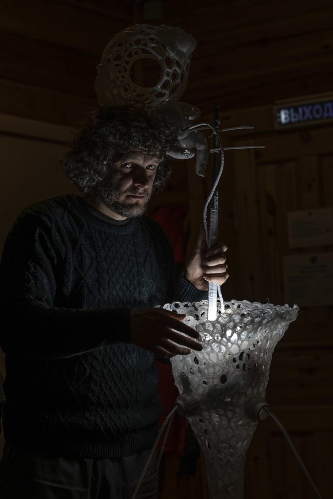 Денис проверяет крепление щупалец у его первой биоморфной скульптуры «Чуча»Фото: Виктор Лягушкин Подобные вещи выпадают из обыденной жизни настолько, что могут вдохновить, к чему-то подтолкнуть… Да и просто: посмотреть на картины во льдах — это как побывать в параллельной вселенной. И я думаю, что можно стать другим человеком после такой выставки.