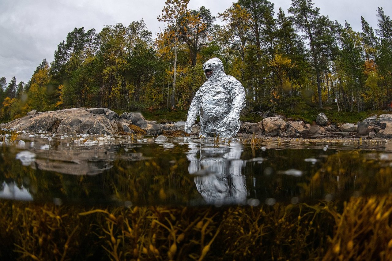Магия воды превращает человека в дурацком костюме из фольги в великана из сказок с головой, достигающей верхушек деревьевФото: Виктор Лягушкин Денис объяснил это так: «Есть термин такой — “морфогенетическое поле”. Он был выведен еще в советское время в 20-30-е годы советскими учеными. Вот, к примеру, самый яркий эксперимент, который дал понять, что существуют какие-то внешние источники, питающие жизнь. Известно, что если поместить куриное яйцо в инкубатор и поддерживать определенную температуру, то вылупится цыпленок. В том эксперименте яйцо помещали в специальную камеру, создавали в ней нужную температуру, но полностью экранировали от внешнего мира. И процесс развития яйца или останавливался, или, если что-то и развивалось, это была бесформенная масса. Получается, есть какие-то внешние источники, без которых живое существо не появляется, хотя яйцо вполне самодостаточно. Эти эксперименты не были признаны в мире, но мне очень нравится идея, и я ее исследую изобразительно».