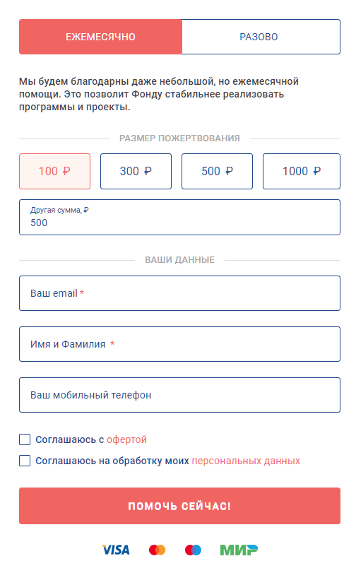 У нас в фонде стояла задача добавить поле контактного телефона, но сделать его не обязательным, по желанию, чтобы мы имели дополнительную возможность связаться с человеком. Бывает, человек срывается с платежа, возникает какая-то ошибка по транзакции.