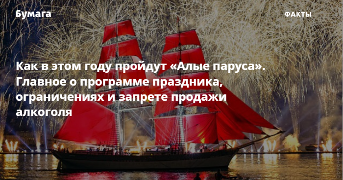 Количество приглашенных на «Алые паруса» в этом году сократится — на Дворцовую площадь пустят только выпускников школ Петербурга и Ленобласти и сопровождающих их учителей. По заявлению вице-губернатора Ирины Потехиной, на праздник пригласят в два раза меньше педагогов, чем обычно. Чтобы попасть на мероприятие, гостям нужно будет предъявить отрицательный тест на коронавирус, сделанный за три дня до праздника, документы, подтверждающие наличие антител, или сертификат о вакцинации. На входе будут измерять температуру, в течение всего вечера приглашенные будут обязаны носить маски. Как организаторы будут это контролировать, не уточняется.