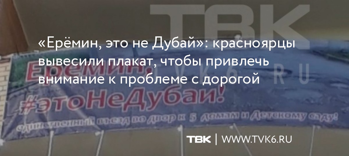 Спустя пару часов плакат «Ерёмин, это не Дубай» снял полицейский. По словам Яны, он не представился и не объяснил, на каком основании это делает. В полиции «ТВК Красноярск» пообещали уточнить подробности позднее.«Так действовать нас вынуждают обстоятельства. У нас здесь находится пять домов, детские сады – и это единственный въезд. Он весь в огромных ямах, нам раздолбали всю дорогу. Мы куда только не обращались уже с этой проблемой», – поделилась Яна.