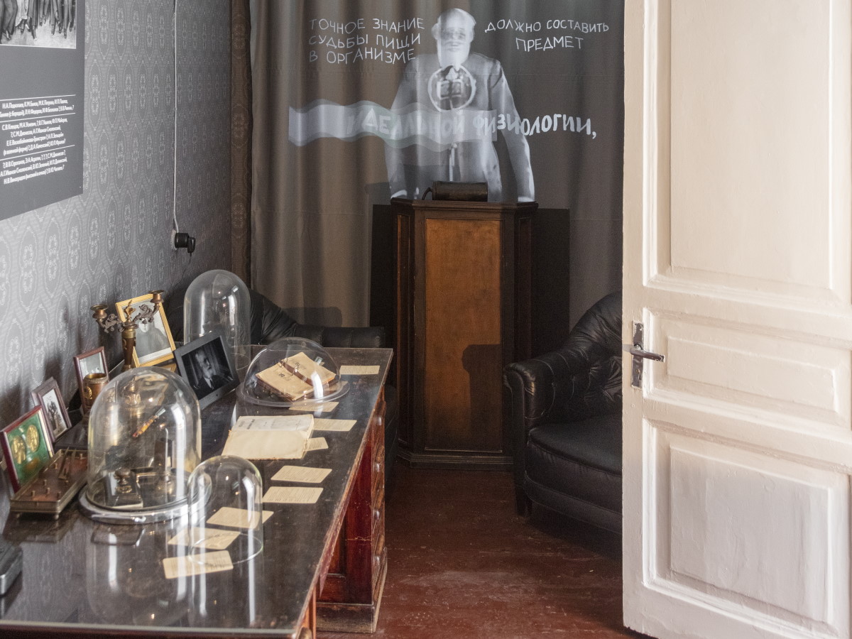 Продолжает экскурсию бывший кабинет физиолога. Его оформление изменили: на стенах поклеили темные обои, а исторические предметы на столе закрыли прозрачными цилиндрами. Здесь же можно найти архивные документы и групповой портрет Ивана Павлова с сотрудниками — похожие изображения руководителей института есть и в других комнатах, они символизируют коллективность любой научной работы. Видеоинтервенцию для кабинета подготовила Марина Алексеева: в дальнем конце комнаты установили сохранившуюся кафедру, на фоне которой показывают видео с фрагментами выступления Ивана Павлова на международном конгрессе физиологов.