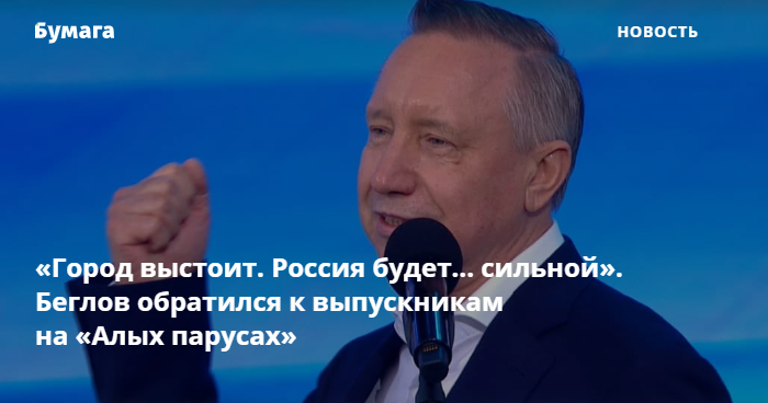 Губернатор Александр Беглов выступил на Дворцовой площади перед выпускникам во время празднования «Алых парусов». Он поздравил их с окончанием школы. Его речь записала «Бумага».