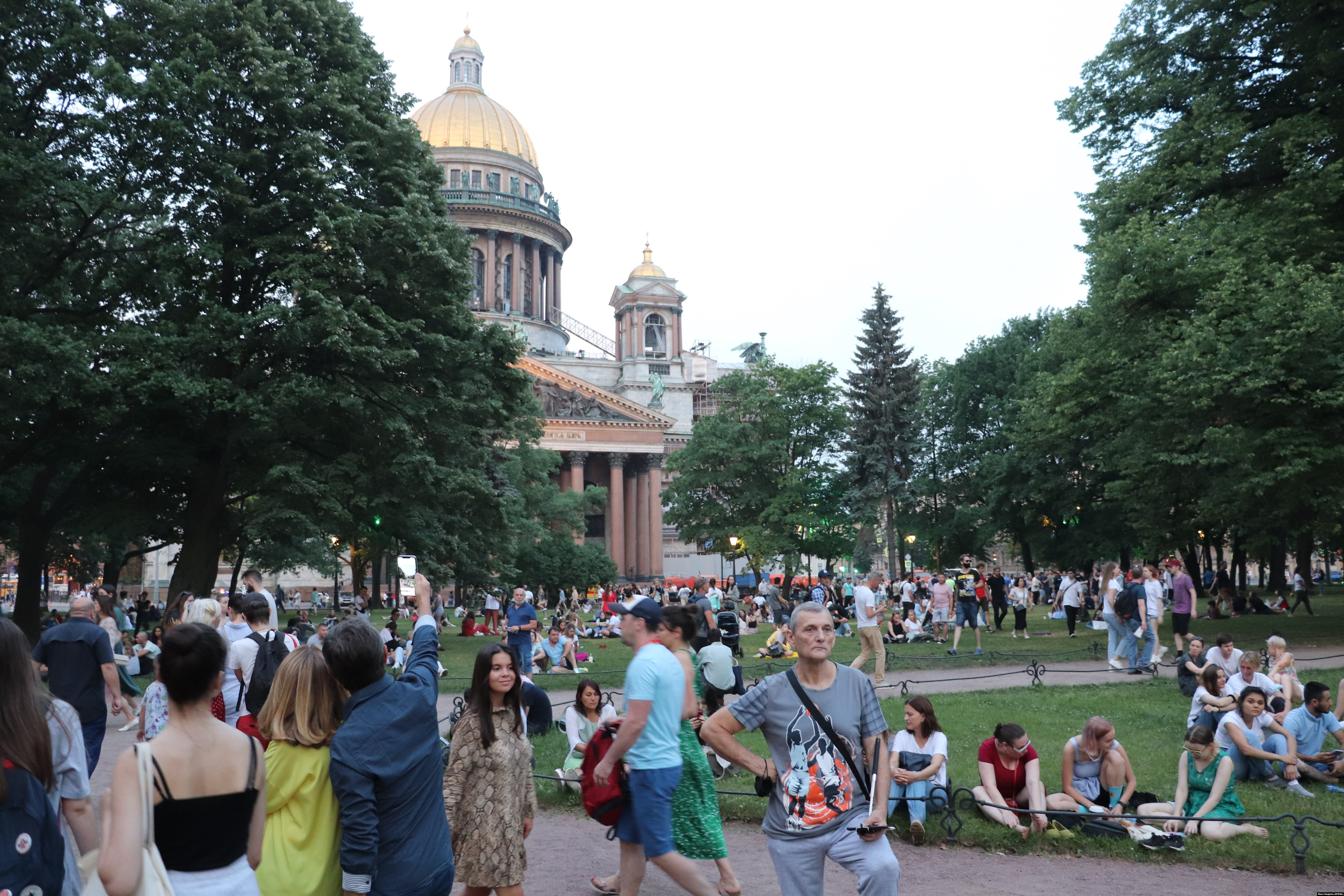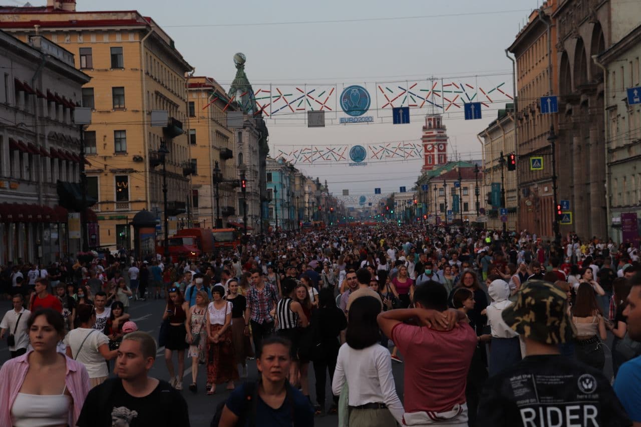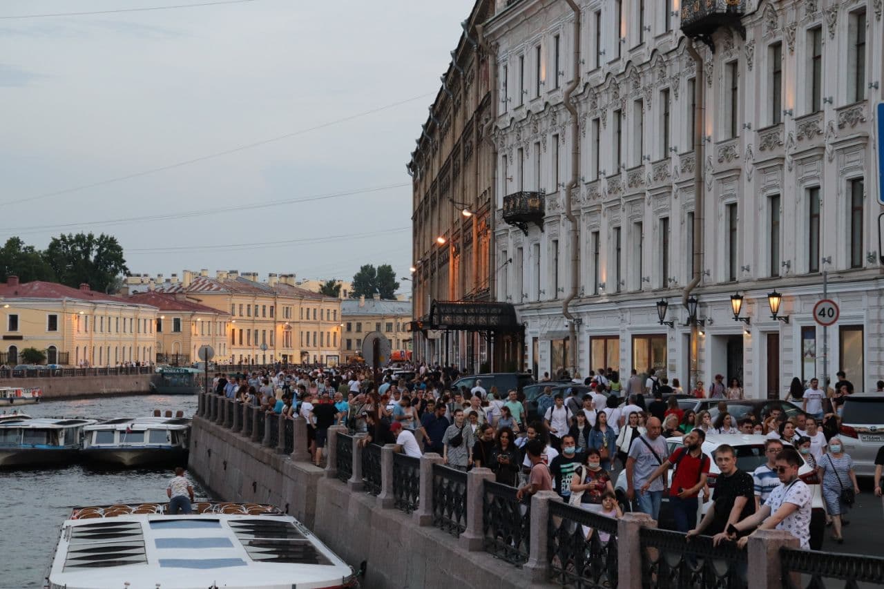 Пока Беглов говорил о сильной России выпускникам, в центре Петербурга начались настоящие массовые гулянья. Без масок, не соблюдая социальную дистанцию, толпы людей ходили по Невскому проспекту, пели песни и веселились, словно нет никаких очередей из скорых около петербургских больниц. На Сенатской площади сотни туристов и петербуржцев решили дождаться салюта – одной из точек кульминации шоу – расположившись на траве. Многие отмахивались, когда им задавали вопросы про коронавирус: "на улице не заболеть", "на улице не страшно", "я переболел" – это были самые частые ответы.
