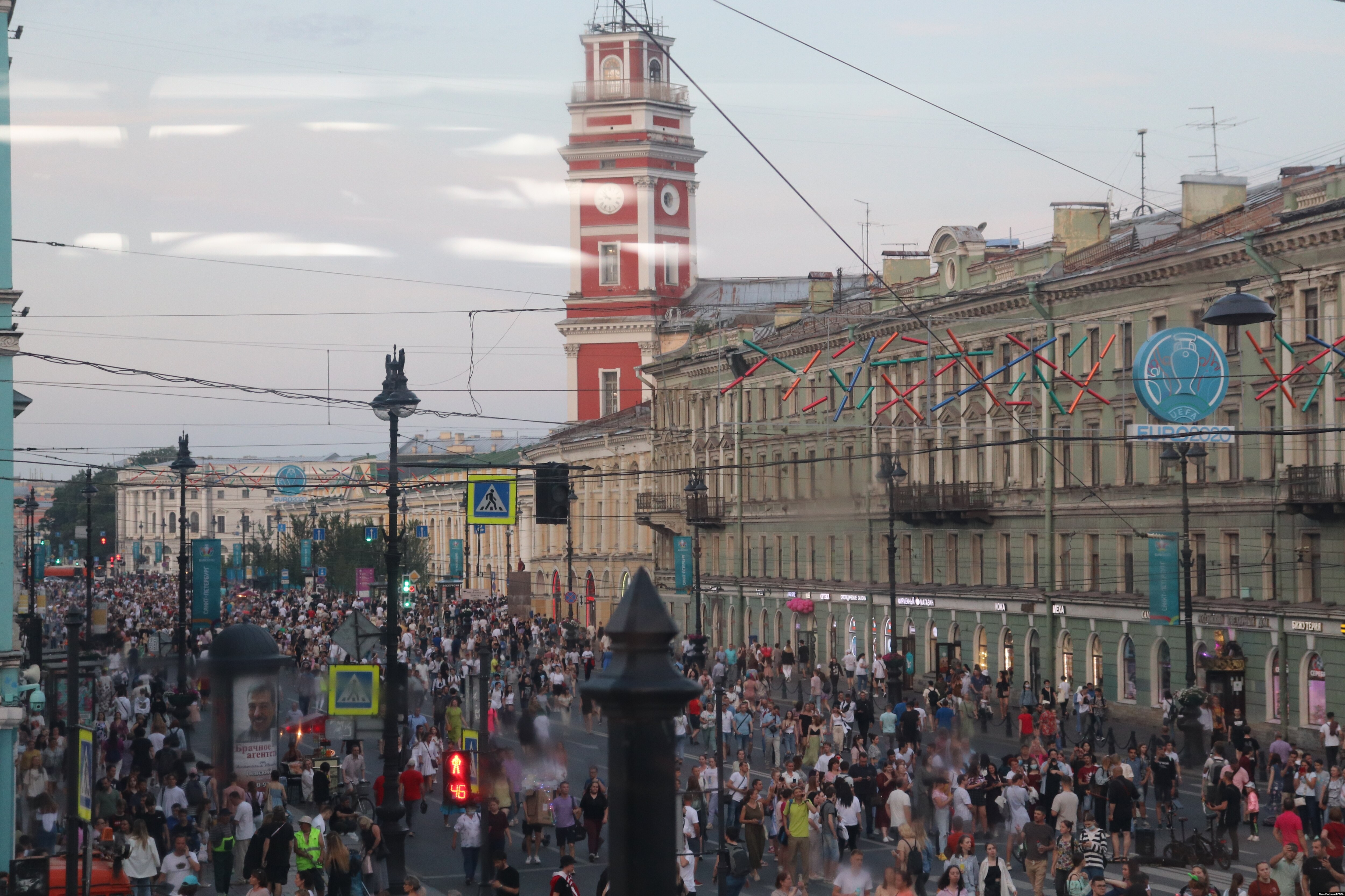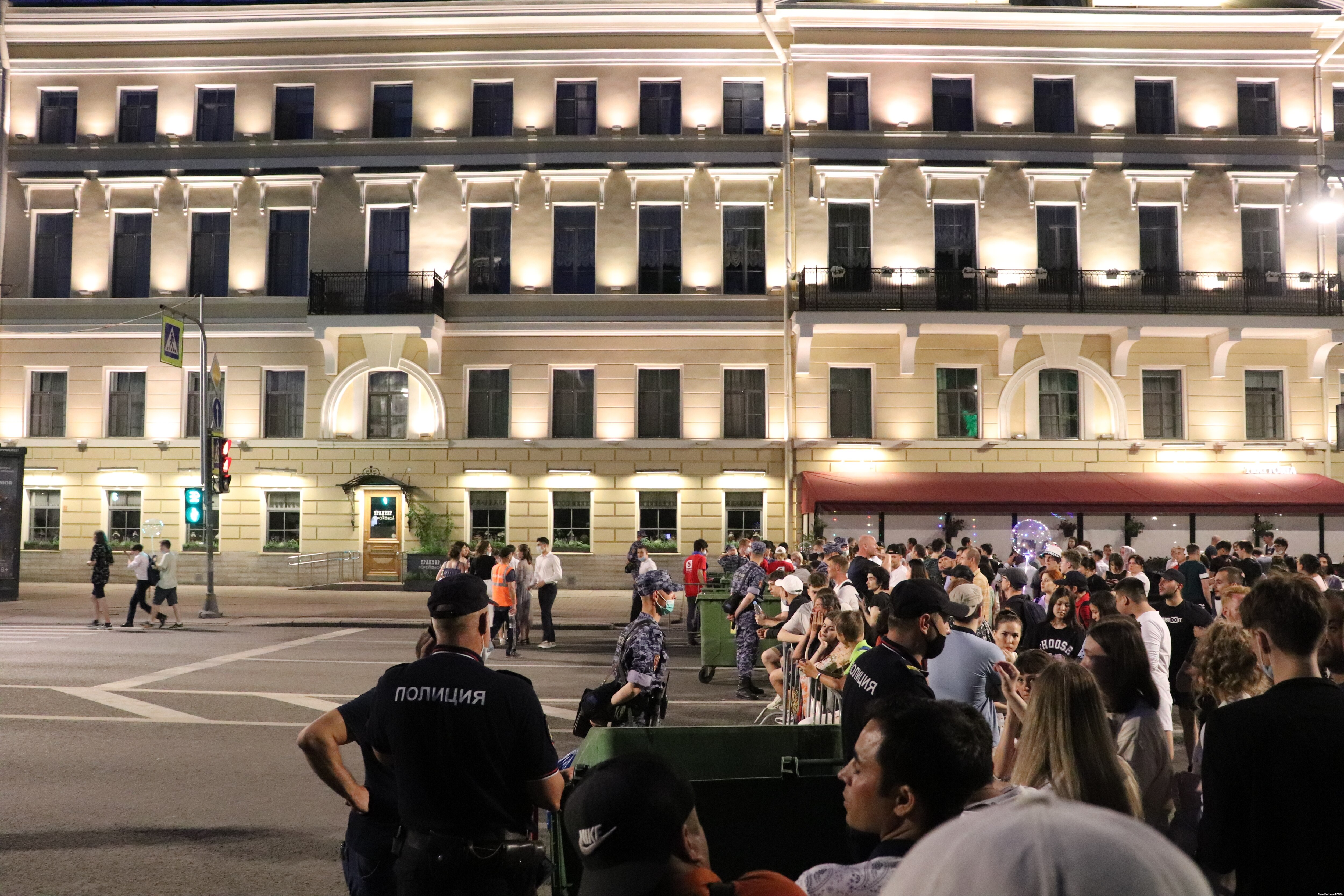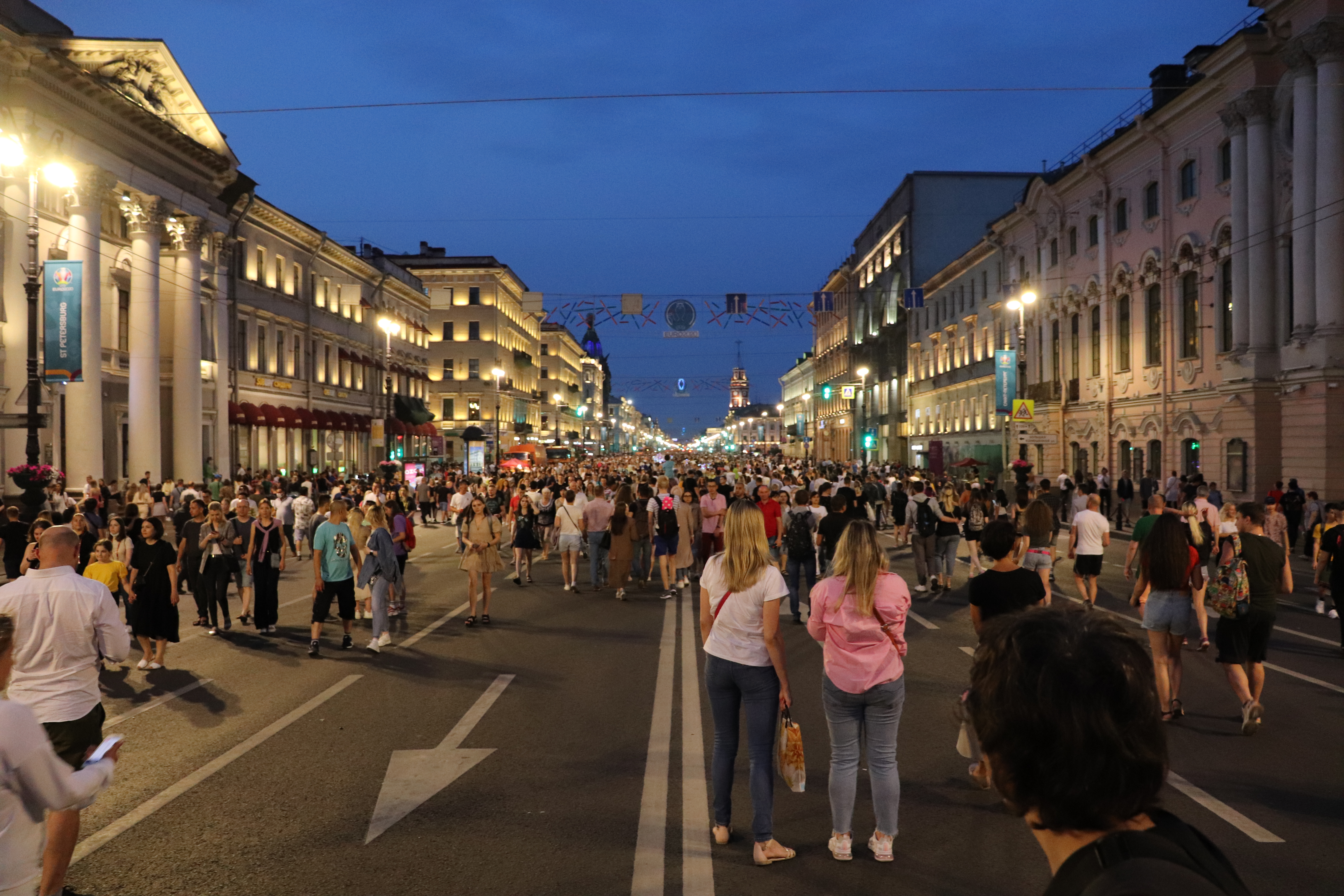 Пока Беглов говорил о сильной России выпускникам, в центре Петербурга начались настоящие массовые гулянья. Без масок, не соблюдая социальную дистанцию, толпы людей ходили по Невскому проспекту, пели песни и веселились, словно нет никаких очередей из скорых около петербургских больниц. На Сенатской площади сотни туристов и петербуржцев решили дождаться салюта – одной из точек кульминации шоу – расположившись на траве. Многие отмахивались, когда им задавали вопросы про коронавирус: "на улице не заболеть", "на улице не страшно", "я переболел" – это были самые частые ответы.