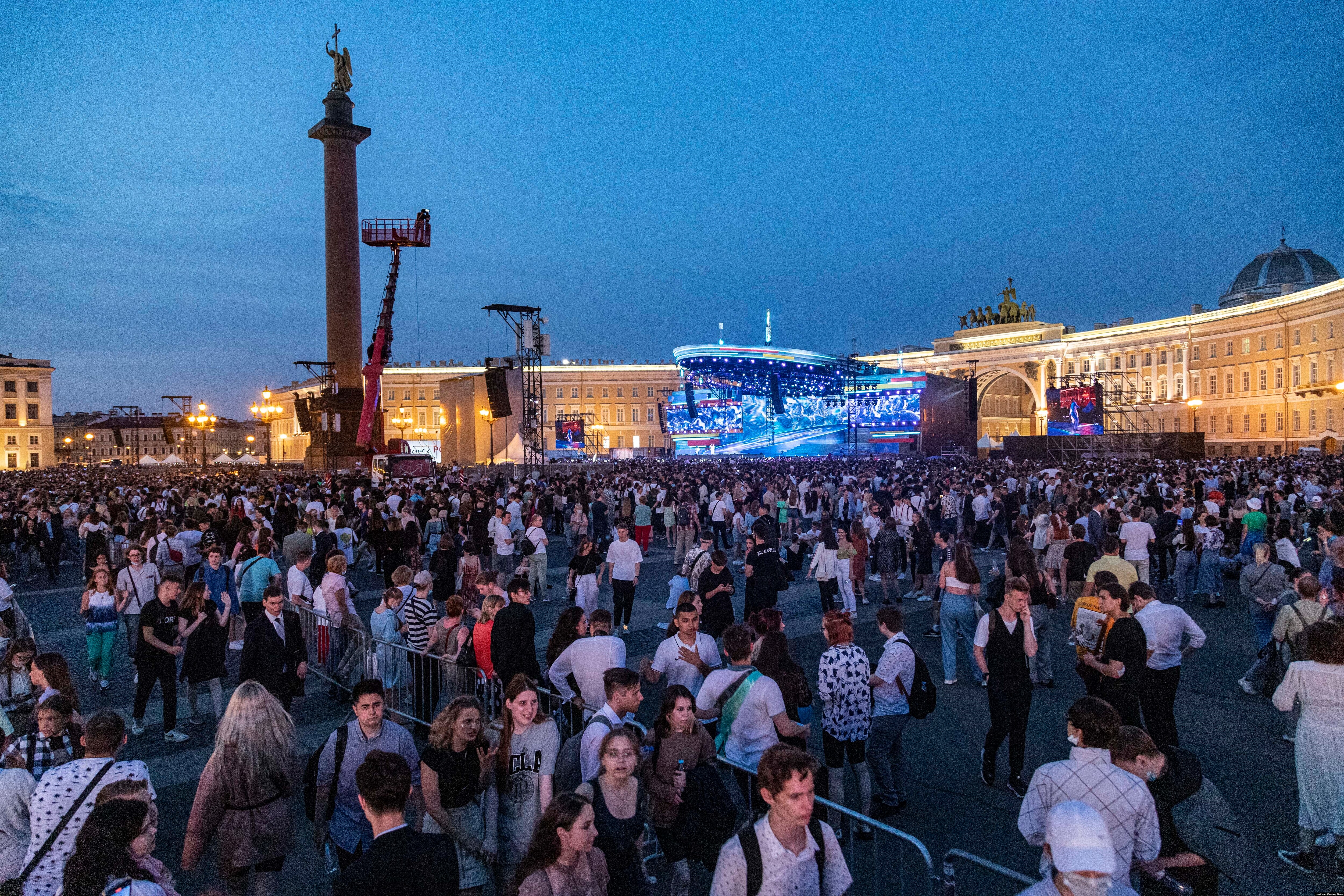 Попасть на праздник на Дворцовую площадь могли только 40 тысяч выпускников вместе с сопровождающими учителями. Концертную площадку оградили металлическими ограждениями, которые полиция использовала зимой и весной во время протестных митингов в поддержку Навального. В этом году из-за коронавируса огорожена была территория значительно больше Дворцовой площади: часть Сенатской площади и Александровского сада, дороги вдоль набережных реки Невы. Около ограждений за несколько часов до начала последнего звонка образовались очереди из выпускников, которые хотели попасть на площадь.