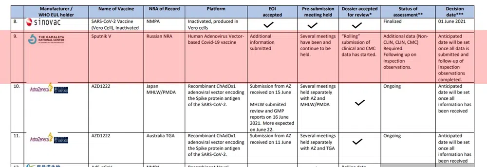 Так, Россия подала предварительную заявку — необходимый документ, чтобы начать процесс оценки. Начался этап проверки результатов клинических испытаний и контроля производства вакцины. При этом ВОЗ ждет от России некоторых дополнительных данных и проводит инспекцию мест, где производится вакцина.
