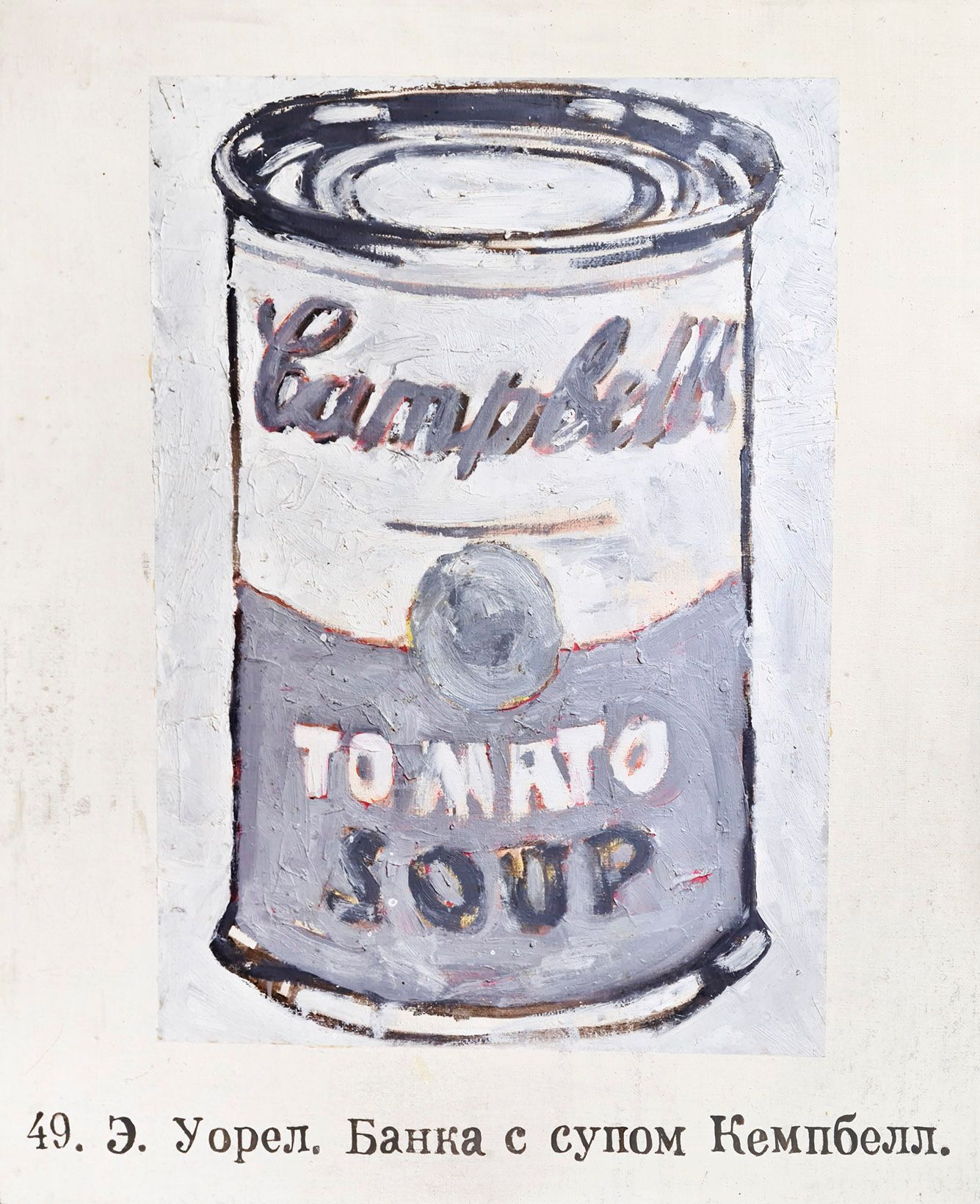 Со знаменитой банкой супа Энди Уорхола все что-то делали. Была попытка художника [Владимира] Чайки создать свою версию бедного крестьянского поп-арта, плохо нарисованного. Работы Уорхола сделаны идеально и просятся в руки, его шелкография безукоризненно исполнена, так делают рекламу. А у Чайки было нарочно криво-косо, такой «наш ответ Чемберлену». [Авдей] Тер-Оганьян нарисовал огрубленный вариант банки супа. Это у многих было. Молодой художник [Дмитрий] Шорин вместо «Супа Кэмпбелл» сделал «Сгущенку». Юрий Альберт переключил внимание зрителей с работ на личность художника своим произведением «Я не Энди Уорхол».