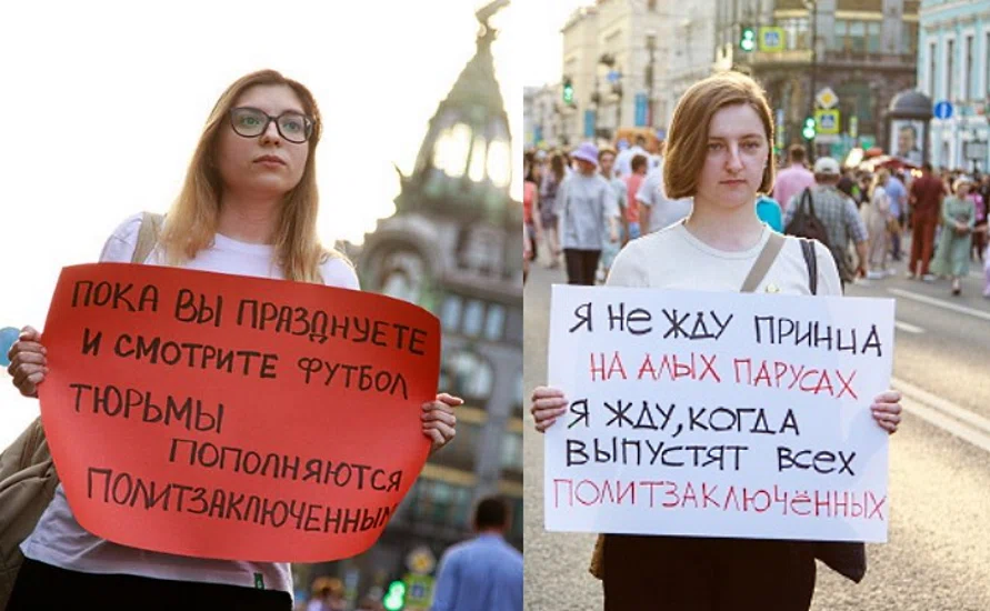 Единственными, кого теперь пытаются привлечь за нарушение антиковидных требований в день «Алых парусов», оказались две девушки — Мария Ширяева и Евгения Сметанкина. Они вышли на Невский с одиночными пикетами, держа в руках плакаты: «Я не жду принца на алых парусах. Я жду, когда выпустят всех политзаключенных».