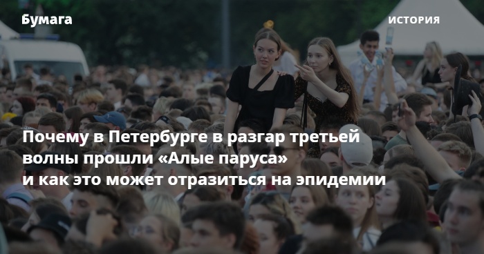 «Бумага» поговорила с побывавшими на празднике выпускниками, эпидемиологом и политологом — и рассказывает, почему в Петербурге разрешали такой масштабный праздник, отчего это решение связывают с миллиардером Юрием Ковальчуком и что эксперты говорят о перспективах заболеваемости после «Алых парусов».