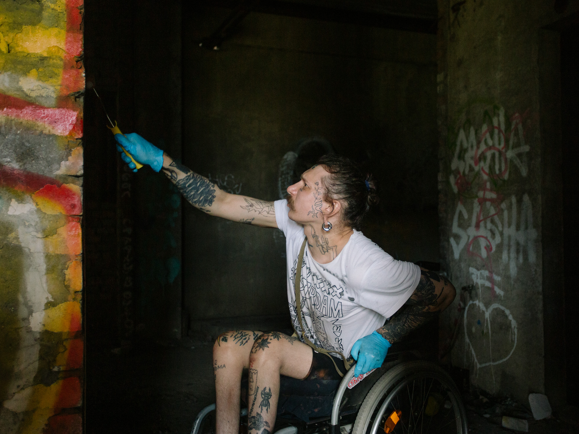 Десять лет назад петербуржец Виталий Дивенцов оступился в заброшенном здании и сломал позвоночник — с тех пор он передвигается на коляске. Он занимается стрит-артом, хотя рисовать на улицах не всегда получается, и организует выставки. А еще Виталий бьет татуировки и проводит мастер-классы по рисованию комиксов для людей с особенностями развития.