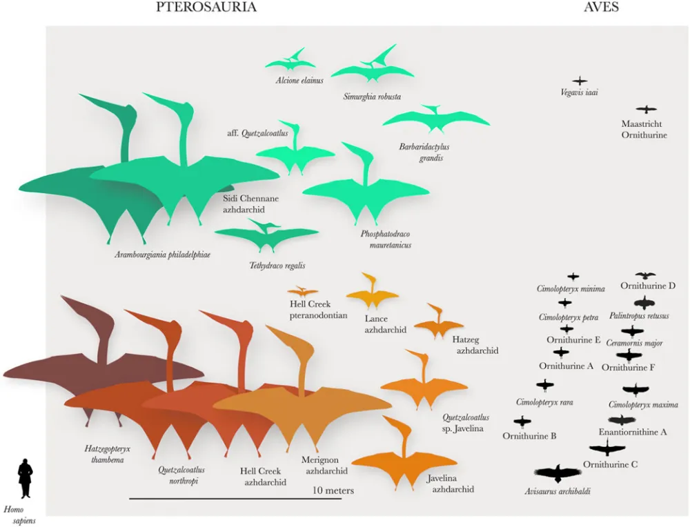 Рис. 10 ниже из статьи со сравнением размеров птерозавров и птиц показывает, что в самом конце мела птерозавры оставались разнообразной группой (три семейства: Pteranodontidae, Nyctosauridae, Azhdarchidae).