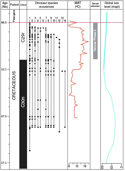 Деканский вулканизм, по-видимому, привел биоту в уязвимое состояние (через колебания климата и pH океана), но сам по себе вряд ли вызвал бы катастрофу. Это подтверждается таймингом вымирания и вулканизма. Впрочем, и астероид сам по себе, возможно, не вызвал бы.