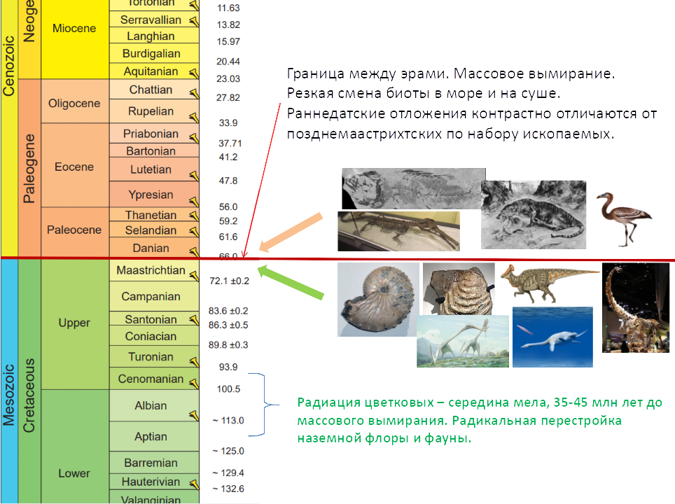 Примерно за 35–45 млн лет до этого рубежа (показано скобочкой) на суше произошла радикальная смена растительности: размножились цветковые растения, сильно потеснив голосеменных. Радикальная смена флоры привела к радикальной смене насекомых и наземных позвоночных.