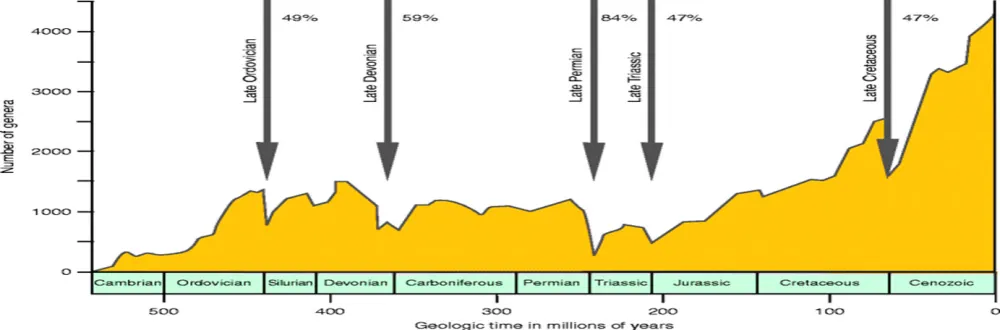 Показано, что многие крупные вымирания совпадают во времени с «внешними» (внебиотическими) воздействиями: резкими изменениями климата и уровня моря, периодами усиленного вулканизма (образованием трапповых провинций, когда изливаются огромные объемы лавы, покрывающие огромную площадь километровым слоем), падением астероидов.