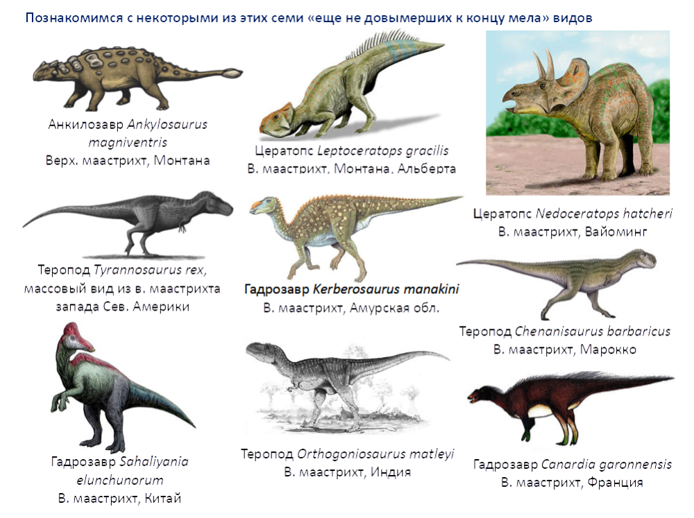Всё это — верхний маастрихт. Вот анкилозавр с его хвостом, подобным палице, — в маастрихте их было 11 родов. Далее — цератопсы, растительноядные динозавры, — большая молодая, быстро дивергирующая группа (23 рода). Тероподы — универсальная форма главного крупного хищника. Мелкие представители обросли перьями, потом научились летать. Они вполне процветали к концу маастрихта, их, нептичьих, было 93 рода. Еще одна молодая группа — растительноядные гадрозавры, которые, по-видимому, питались именно цветковыми растениями. Эта группа как раз расцвела при появлении покрытосеменных. Их в маастрихте было 46 родов.