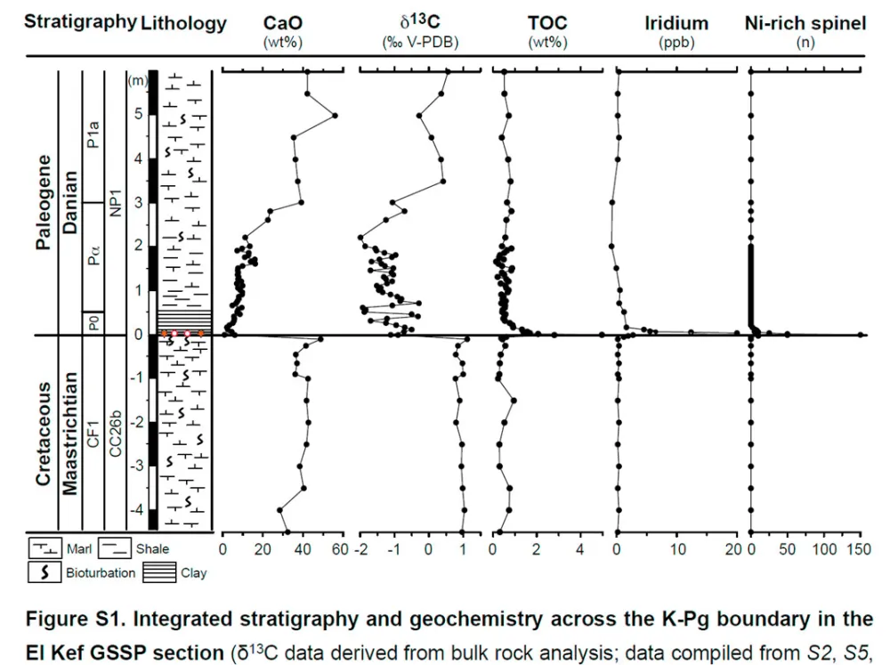 В сотнях разрезах по всему миру в пограничном K/Pg слое — импактные выбросы. Все датировки совпадают: резкое вымирание планктона, импактные выбросы, иридий, падение содержания кальцита (так как вымер планктон с известковыми скелетами). Были сомнения и споры (например, была идея, что метеорит упал за 300 тыс. лет до рубежа), но сейчас всё разрешилось.