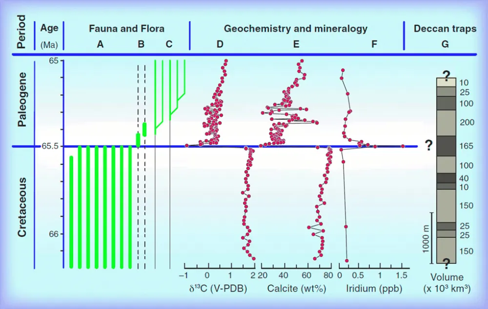 Главный аргумент против ведущей роли траппового магматизма в мел-палеогеновом вымирании: излияние Деканских лав началось за полмиллиона лет до рубежа K-Pg и массового вымирания (и падения метеорита).