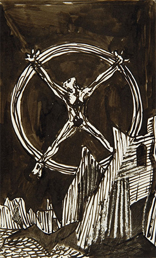 Другую иллюстрацию, отсылающую к «Золотому сечению» Леонардо, можно трактовать как символ человека вообще, идеального человека, но уже не гармонично вписанного во Вселенную, а распятого в ней.