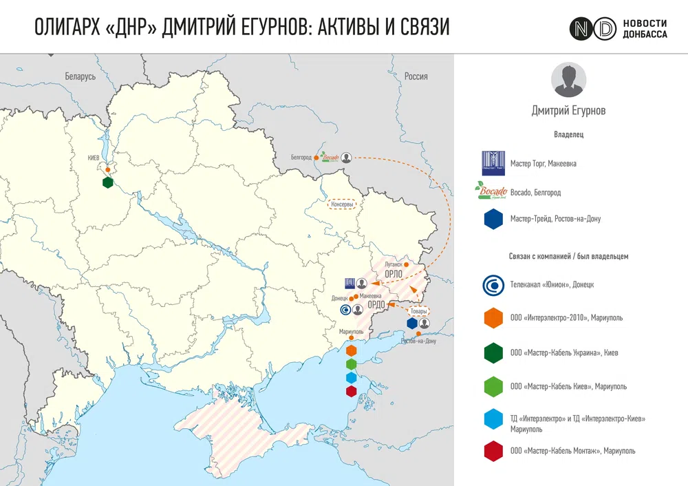 В ноябре 2014 года он создал ООО «Мастер-Торг» и зарегистрировал его в неподконтрольной Украине Макеевке (в обход украинской налоговой). Сейчас компания Егурнова, как сказано на ее сайте, — главный дистрибьютор продуктов питания в «ДНР» и «ЛНР».