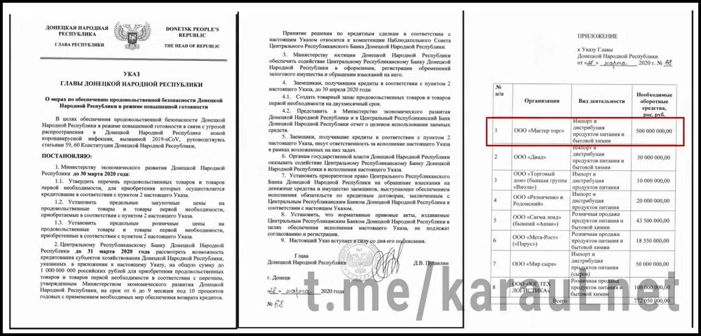 Интересно, что объем средств, выделенных другим компаниям, совокупно меньше, чем сумма, которую выдали «Мастер-Торгу». Этот так называемый «указ» о выделении средств скрыт на сайте Пушилина, но попал в сеть в результате «слива». От «ДНР» компания Егурнова за два года получила 11 миллионов рублей ($150 тыс.) заказов на тендерах. Это доказывает ее особое положение.