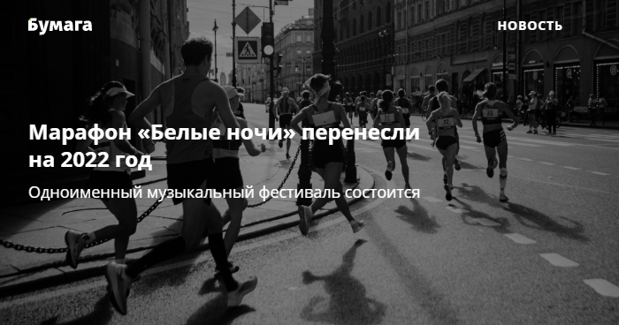 Марафон «Белые ночи», который должен был пройти в Петербурге 17 июля, перенесли на следующий год. Об этом «Бумаге» сообщили в пресс-службе «Бегового сообщества».