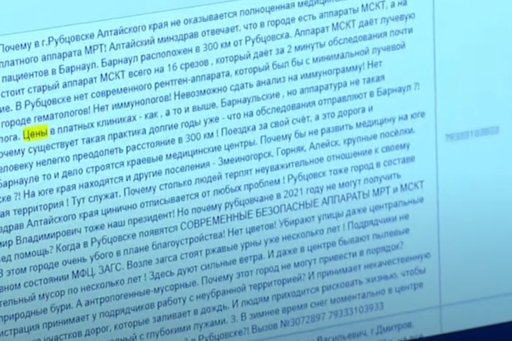 Например, крупным планом был показан незамазанный номер жителя алтайского Рубцовска, который пожаловался на нехватку медицинской помощи и аппаратов МРТ в городе.