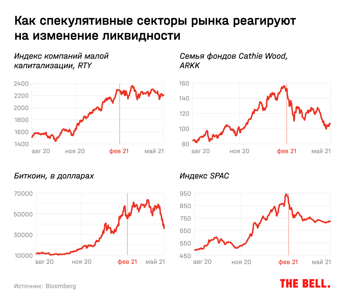 Тревожные звоночки уже слышны. С 19 февраля 2021 года самые спекулятивные сегменты рынка показывают очень слабую динамику. В этот день капитализация биткоина впервые превысила триллион долларов. Последний стимул с чеками всем американцам от новой администрации Байдена, принятый в марте, тогда был еще впереди, но рынок уже начинал терять пар. Ключевые спекулятивные секторы рынка, которые остро реагируют на ликвидность, уже указывают: ее становится меньше. Вот как вели себя эти показатели — Bitcoin, семья фондов Cathie Wood ARKK, SPACs и индекс компаний малой капитализации Russell 2000 (RTY) — с февраля.