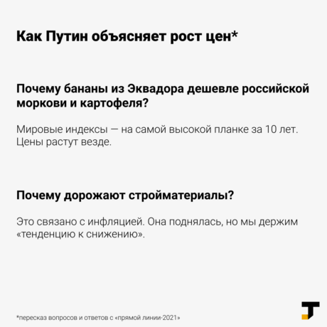 Дата30.06.2021АвторСкрытИсточникTJournalСохранённая копияInternet ArchiveOriginal MaterialShow translationПутин и рост цен — в одной картинке Объяснения президента после вопросов на «прямой линии». Подробно о бананах из Эквадора и моркови из российских регионов;Подробно о стройматериалах.#линияпутина2021