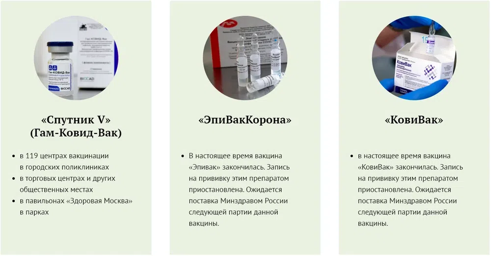 Сообщается, что ожидается поставка Минздравом России следующей партии вакцины. На этой неделе в столице также была приостановлена запись на вакцинацию от коронавируса препаратом «КовиВак» разработки Центра имени Чумакова, так как вакцина закончилась. Таким образом, исходя из данных мэрии, сейчас в Москве привиться можно только вакциной «Спутник V» («ГамКовидВак»), разработанной центром имени Гамалеи.