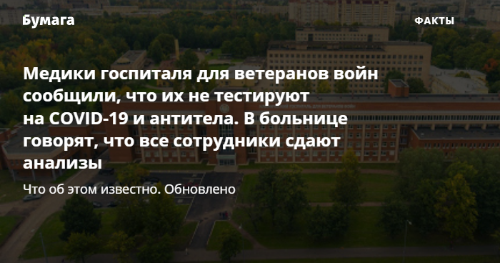 Госпиталь для ветеранов войн на Народной улице в середине июня снова стал принимать пациентов с COVID-19. Источники «Бумаги» обращают внимание на ряд проблем: перед началом работы их не протестировали на антитела, а сейчас не берут ПЦР-тесты. В госпитале утверждают, что все работающие в «красной зоне» сотрудники сдают ПЦР-тесты, на антитела их тоже проверяют.