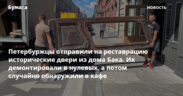 Петербуржцы отправили на реставрацию исторические двери из дома Бака. Их демонтировали в нулевых, а потом случайно обнаружили в кафе
