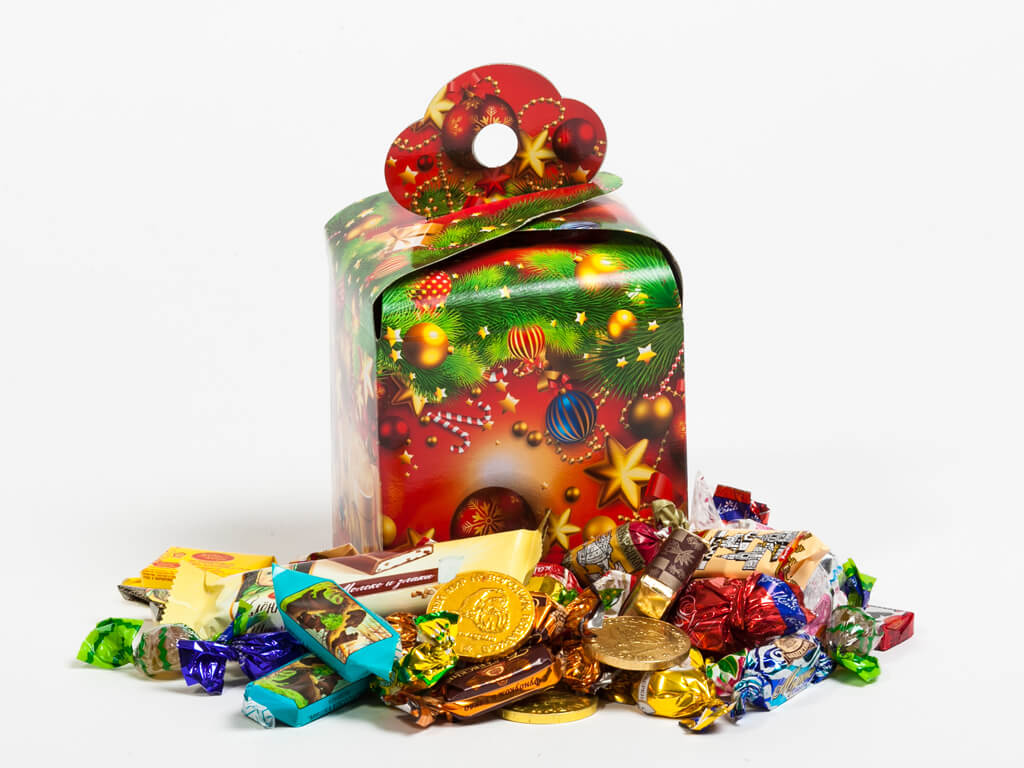 - откажитесь от карамелек. Совсем без них подарочных комплектов обычно не бывает, но постарайтесь найти такие, где их будет меньше всего. Дело в том, что карамельки практически никто не любит, поэтому они съедаются последними. К тому же дети грызут их, а это опасно для зубов;
