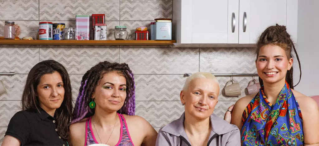 На фото, о котором идет речь, изображены четыре женщины за столом: собственно пара, сестра одной из девушек Мила и ее мать. Как и остальные участники публикации в своем интервью они рассказывают о том, как они живут, кто у них готовит, кто ходит за покупками и так далее.