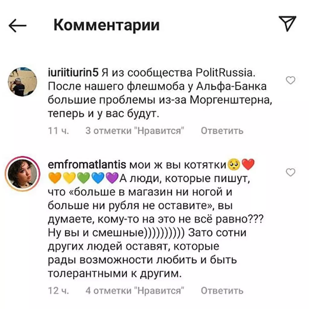 Среди негативных отзывов сеть ожидаемо получила и угрозы. Так один из пользователей пишет, что бренд ждут те же «проблемы», что имел «Альфа банк» после объявления о коллаборации с Моргенштерном. Имея в виду массовую публичную кампанию, которую поборники морали некоторое время назад развернули против банка из-за участия в его рекламе спорного исполнителя.