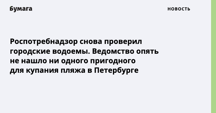Петербургское управление Роспотребнадзора снова проверило 24 городских водоема и снова не нашло ни одного пригодного для купания, об этом сообщает пресс-служба ведомства.