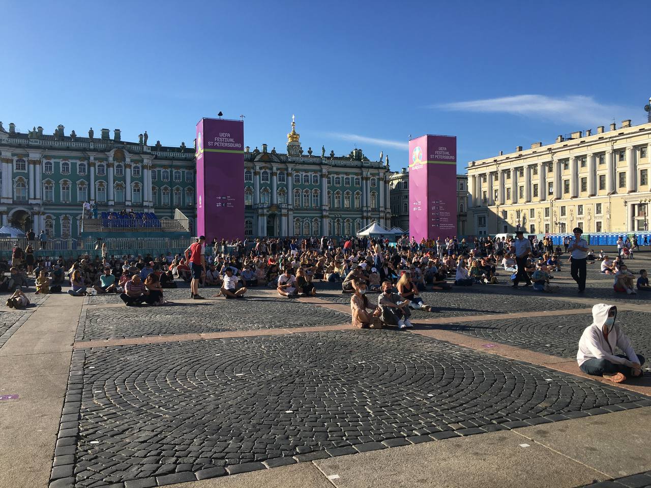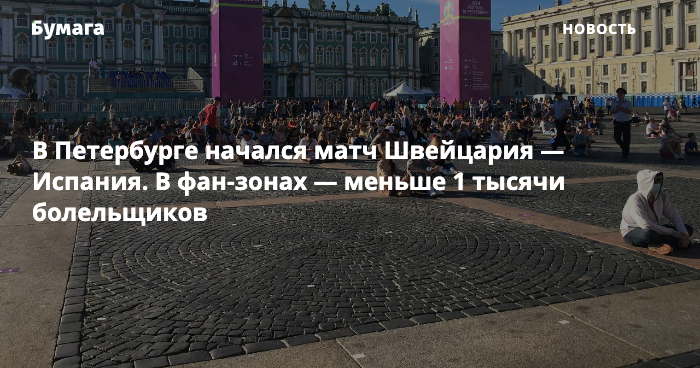В Петербурге начался матч Швейцария — Испания. В фан-зонах — меньше 1 тысячи болельщиков. Например, на Дворцовой площади сейчас 230 человек, а в «Футбольной деревне» — 630, сообщается на сайте петербургских фан-зон.