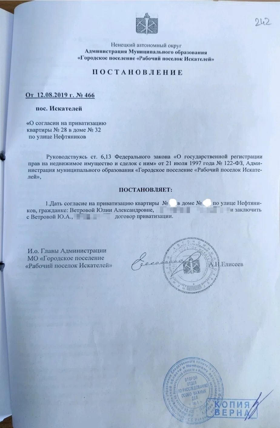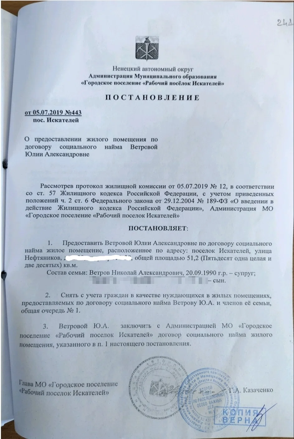 Вопрос с квартирой в итоге был решен руководством поселка — именно администрация распоряжается недвижимостью. Однако спустя год в УМВД России по НАО поступило анонимное обращение: якобы Ветрова получила жилье незаконно. МВД редко реагирует на анонимки, но в этот раз сделали исключение — провели проверку. 10 августа 2020 года направили запрос в администрацию поселка с требованием предоставить все документы, касающиеся получения жилища. Заодно оперативники опросили всех действующих лиц.