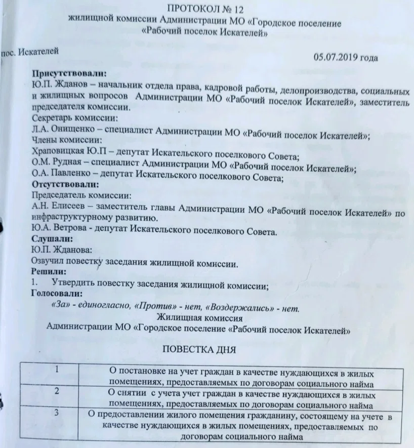 5 июля 2019 года в здании администрации было запланировано заседание жилищной комиссии. На повестке всего три вопроса, один из которых — выделение жилплощади для гражданки Ветровой. Согласно протоколу № 12, на заседании присутствовали беспартийный Жданов, единороссы Храповицкая, Павленко, юрист Рудная, вела протокол Онищенко. Председатель комиссии Елисеев находился в отпуске, самой Ветровой тоже не было. Все присутствующие проголосовали единогласно и рекомендовали главе поселка выделить Ветровой жилье. В конце документа стоят подписи Жданова и Онищенко.