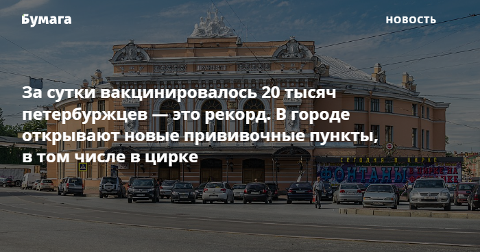 С 6 июля пункт вакцинации от коронавируса без предварительной записи откроется в Большом Санкт-Петербургском государственном цирке на набережной Фонтанки, 3А, сообщили «Бумаге» в пресс-службе. Он будет работать с 12:00 до 14:00 до 7 июля, дальнейший график обсуждается. Каждому вакцинированному подарят билет на цирковое представление.