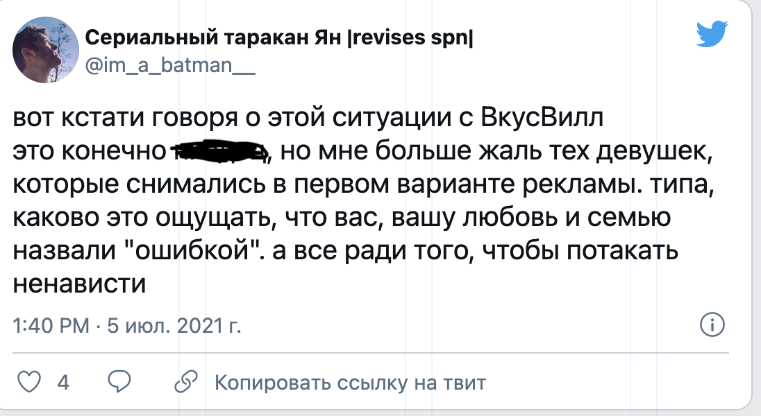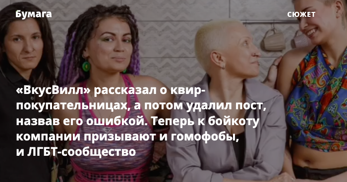 Сеть магазинов «ВкусВилл» 2 июля опубликовала в инстаграме серию видеороликов с семьями своих посетителей, в том числе с квир-семьей из четырех девушек. Пост с лесбийской парой и их дочерьми широко обсуждался в интернете: одни хвалили компанию за поддержку ЛГБТ, другие раскритиковали ее и начали угрожать героиням. Спустя два дня «ВкусВилл» удалил пост о покупательницах, назвав его ошибкой, и принес извинения. Этим сеть вызвала еще одну волну негатива.
