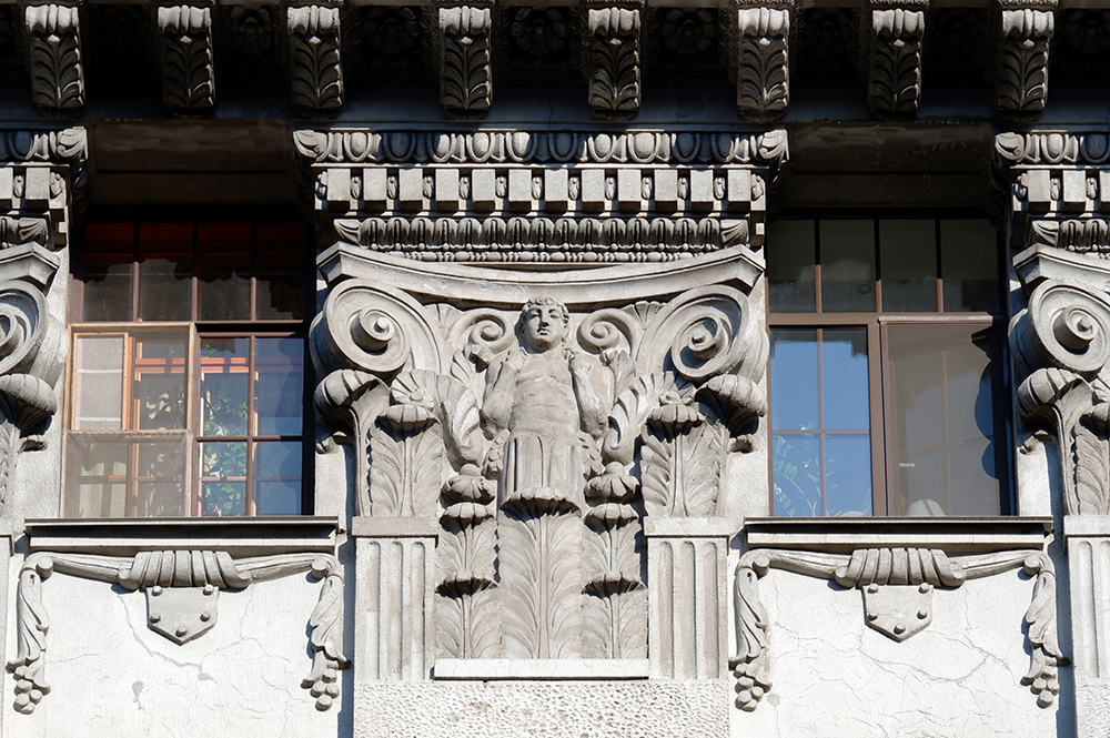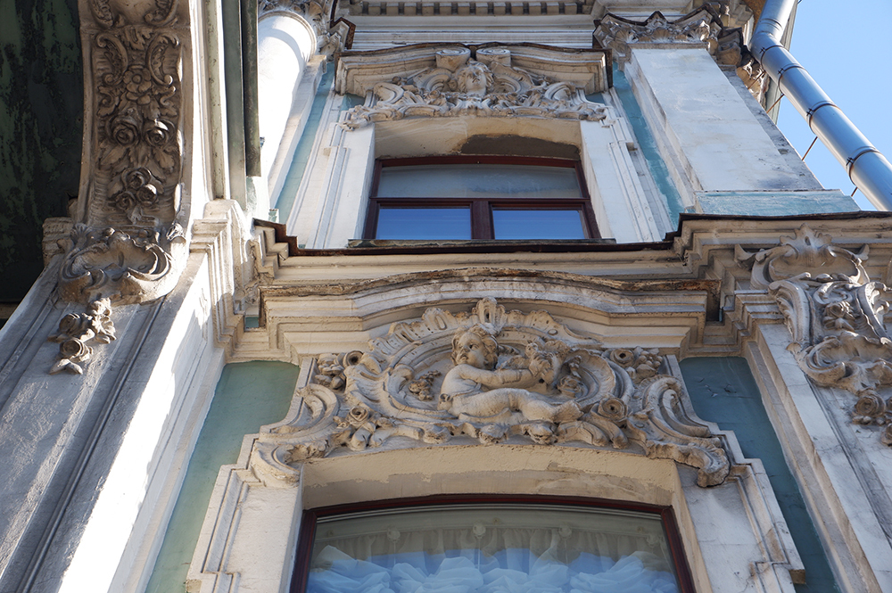 Как и дом Адамини, вскоре после окончания войны здание отстроили в прежнем виде. Фасады вернули к пышному облику, задуманному придворным архитектором Гарольдом Боссе в середине XIX века. Он спроектировал этот особняк для статс-дамы Елизаветы Михайловны Бутурлиной, ушедшей на покой светской львицы 1830-х. Облик дома выдержан в стиле барокко, которое к тому времени уже почти столетие как вышло из моды. Выбор столь старомодного стиля подчеркивал статус старой дворянской семьи Бутурлиных, а заодно и ее устойчивое финансовое положение — украшение необарочных фасадов и интерьеров влетело в копеечку. Витражные окна, богатый лепной декор, фигурки взрослых ангелов и младенцев-путти, наличники! При взгляде на дом легко вообразить, что построен он не во времена великих реформ Александра II, а в легкомысленное царствование Елизаветы Петровны.