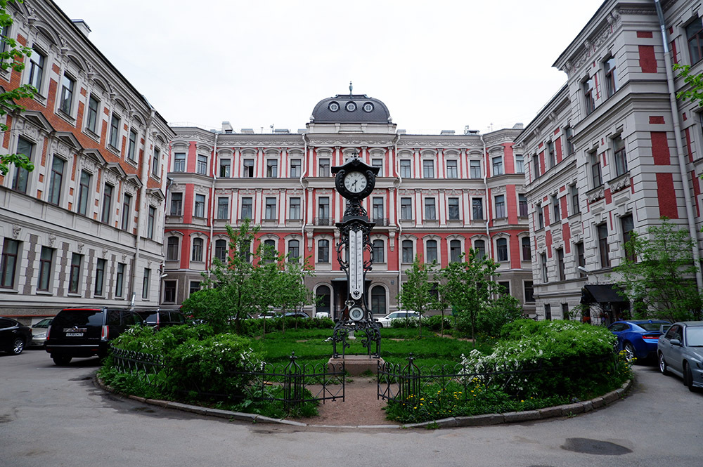В разное время в нем успела пожить чета хозяев богатейшего в Российской империи поместья Муромцево граф и графиня Храповицкие, министр финансов граф Владимир Коковцев. Тут же находились дипмиссии Китая и Болгарии. А принц Сиама Чакрабон, именно по этому адресу, в салоне у Храповицких впервые встретился со своей будущей супругой — русской мещанкой Екатериной Десницкой. Хотя прежние роскошные квартиры в советское время и обратили в коммуналки, в самом доме и его дворах сохранилась масса интересных архитектурных деталей. Взгляд приковывает кованая решетка курдонера, часы (бывший барометр), лепные украшения, витражи на парадной лестнице, отделка интерьеров натуральным мрамором, узорной плиткой и деревом.