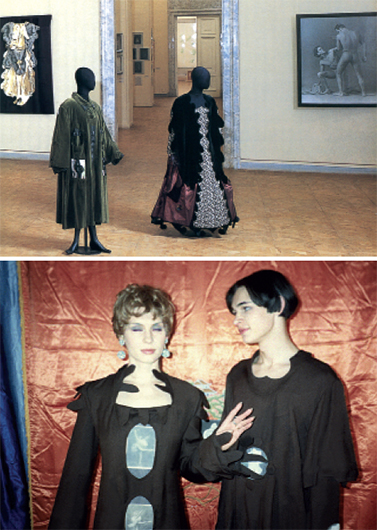 © «Искусство — XXI век» Произведения К. Гончарова и А. Соколова на выставке «Отдел новейших течений: первые пять лет» в Государственном Русском музее. 1996Константин Гончаров. Платья «Гимназические». 1994; слева — И. Куксенайте Петербургский стиль связан с образом угасающей аристократии. Это явление не относится к социальным кругам, а только лишь к миру искусства: оно вызвано к жизни интонацией, изначально присущей городу, который казался живописной руиной с первых лет своего существования. Этот стиль был осознан и описан как одно из проявлений гения места художниками и критиками из круга Сергея Павловича Дягилева. И сразу начался его европейский триумф. Европа на рубеже столетий открыла в образе петербургского искусства заветный тайник, где хранились ее редкости, любовные сказки, дорогие вещицы, где все было сделано по душе идеальному европейскому уму и уснащено мужским очарованием грубого варварства, прирученного, но не загашенного культурой. Прелесть дягилевских балетов заключалась в никогда не надоедающем перечислении любимого. Как в детской игре в секреты, когда сокровища — самый красивый фантик и найденная мертвая бабочка, аккуратно расправленные между двумя стеклами, зарываются в песок и потом тихо-тихо, как будто случайно, разгребаются, и вот уже взору открыта чудесная картина, которую, насмотревшись, можно снова засыпать, чтобы вернуться к ней завтра с утра, волнуясь: все так же ли она хороша, не промочил ли ее дождь, не раскопали ли ее жуки и главное — не появилось ли в ней что-то новое, волшебное. Так и в платье «Строгого юноши» — пальцы вольны погладить готический бортик кармана, еще раз приятно наткнуться после драповой чуть душной мягкости на прохладную гладь внутренней шелковой беечки, перебраться на рядок твердых пуговиц и воздушных петель; они могут скользить по капроновой оболочке секрета — тщательно вшитого бархатного круга — ложа павлиньего пера или тряпочного нарцисса.